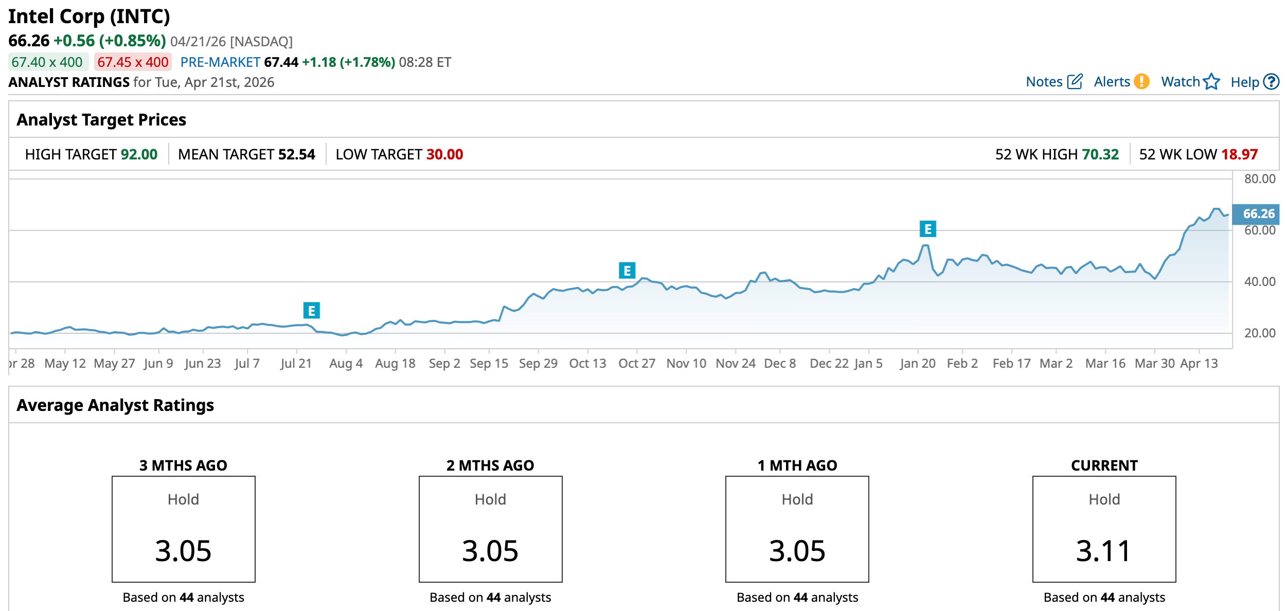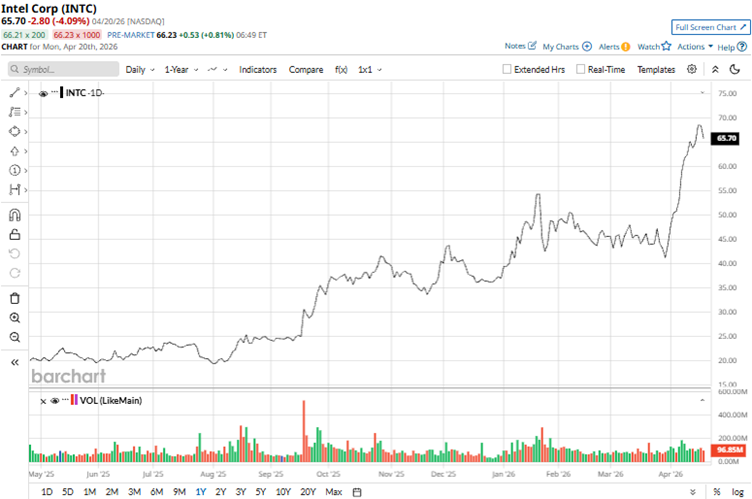 Over the past 52 weeks, Intel’s stock has gained 251.7%, while it has been up 79.57% year-to-date (YTD). It reached a 52-week high of $70.33 on April 17, and is down only 5.8% from that level.
